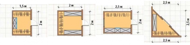 | Квадрат | 2500 х 2000 мм. | При большей площади гардеробной по середине комнаты образуется бесполезное пространство. Совет: в центре поставьте пуф или кушетку |