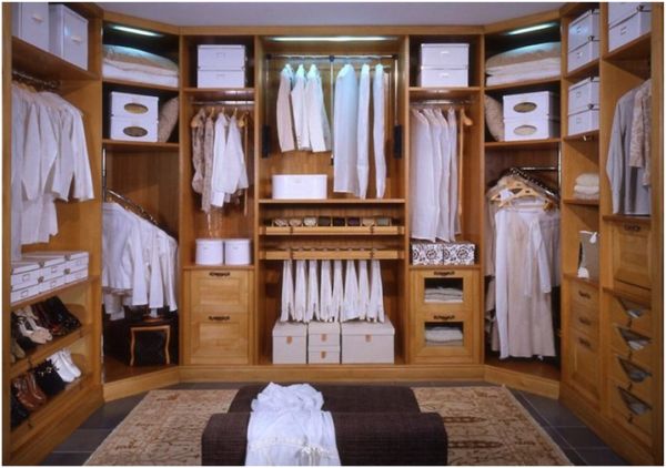 Существуют не только отдельные, но и проходные гардеробные, их явный минус – вещи не всегда закрыты от пыли и взора гостей. Сквозная гардеробная комната соединена со спальней, ванной или гаражом.